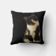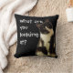 Schwarz-Weiß-Katze mit Haltungsmotto "Was schauen Sie sich an" auf Kissen.