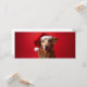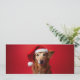Porträt eines Hundes, der auf rotem Grund Weihnachtsmütze spielt. Er hat die Ohren hoch und sieht aus wie ein Labrador