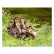 Eine köstliche Brut von Stockenten-Entenlingen schaut von ihrem weichen Grasnagel neben einem ruhigen Teich aus.