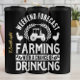 Diese Grafik zeichnet sich durch ein gewagtes, weißes Typografie-Design auf einem soliden schwarzen Hintergrund aus. An der Spitze ist "WEEKEND FORECAST" über einem zentralen Motiv angeordnet. Dieses Motiv enthält eine weiße Silhouette eines Traktors, der durch einen Kranz von Blätter gerahmt ist, mit einem Huhn auf beiden Seiten. Unten wird das große Wort "FARMING" angezeigt, gefolgt von "MIT EINER CHANCE OF", flankiert von stilisierten Weizensymbolen, und schließlich "TRINKING" ganz unten.