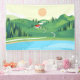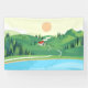 Illustration im flachen Stil des Hauses im Hügel mit See und Wald nahe schöner Landschaftsdarstellung