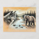 wolf and a bear encounter each other by the river, illustrated in soft charcoal and pastel tones, capturing a dramatic and serene moment in the wilderness.