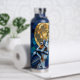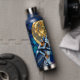 A wildlife themed water bottle. A vibrant colorful ai illustration of a mosaic style wolf, an owl and a full moon in a stained glass vibe.