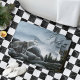 Zwei Wölfe sitzen zwischen Felsen außerhalb eines Schlosses. Berge um sie herum.