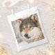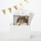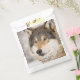 Tiere, Wildtiere, Wildtiere, Lumberjack zum Thema Geburtstag. Foto eines Wolfskopfes. Ein freundlich aussehender Wolf mit einem Lächeln auf dem Gesicht. Es ist Winter mit weißem, schneebedecktem Hintergrund. Für die 7. (oder jedes Alter) Geburtstagsfeier eines Jungen. Personalisieren und fügen Sie den Namen des Kindes, schwarze Buchstaben.