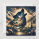 Bild in einem Bild. Ein Wolf heult auf dem Mond mit Bergen und Waldhintergrund.