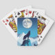 Karten spielen in einer schwarzen Silhouette eines Wolfs, heulen auf einem großen Vollmond, stehend auf einem Berggipfel mit eisbedeckten Bergen im Hintergrund