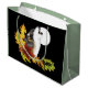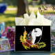 Ein Wolf heult auf Vollmond mit Herbstblättern und Eicheln in schwarzer Umgebung.