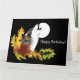 Ein Wolf heult auf Vollmond mit Herbstblättern und Eicheln vor schwarzer Kulisse