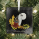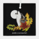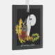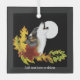 Ein Wolf heult auf Vollmond mit Herbstblättern und Eicheln in schwarzem Hintergrund.