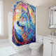 Ein wunderschöner Wolf mit Blick auf die Berge und dem Sonnenuntergang dahinter in einem Bleiglas-Motiv.