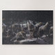 Schöne graue Wölfe in einem Pack, ruhen auf einem Felsen bei Dämmerung.
