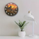 Wilderness wall clock depicts a watchful adult wolf standing on rocks with three curious pups, bathed in golden sunset light over mountain forests. White numerals on warm-toned backdrop create serene wild beauty—perfect for nature lovers or family-themed gifts.