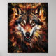 Wolf-Portrait im Feuer- Das Bild zeigt ein nah-aufgelöstes Bild eines Wolfs, das in einem lebendigen und energetischen Stil dargestellt wird. Das Fell des Wolfs ist eine Mischung aus braun, schwarz und weiß, mit einer wichtigen rötlich-braunen Farbe um Gesicht und Hals. Seine Augen sind eine durchdringende gelbe Farbe, und sein Mund ist leicht offen, die scharfen Zähne.