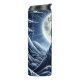 Dieses Bild zeigt einen majestätischen Wolf, der gegen einen hellen Vollmond silhouiert ist und auf einer stilisierten, blauen Berglandschaft heult. Der Nachthimmel ist voll von einem Himmelslicht, funkelnden Sternen und Wolkenformationen, die die traumhafte, ätherische Qualität der Szene verbessern. Die Berge sind mit aufwändigen, gewellten Mustern übersät, die ihnen eine einzigartige Textur verleihen.