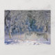 Zwei Wölfe stehen am gefrorenen Rand des Waldes. Schneebedeckte Bäume stehen hoch, während sich der kondensationale Nebel aufhebt, während die Sonne den Yellowstone Nationalpark wärmt.