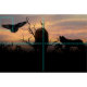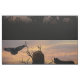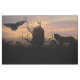 Zwei Wölfe und ein fliegender Rabe auf einer silbernen Landschaft und einem Wolkenuntergang.