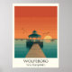 Erfassen Sie den friedlichen Charme von Wolfeboro, New Hampshire, mit diesem vintage-inspirierten Design. Es zeigt einen malerischen Seeblick auf einen Pavillon unter einem atemberaubenden Sonnenuntergang, der sich im ruhigen Wasser spiegelt.