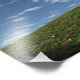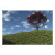 Eine friedliche 3D-Landschaft im Frühling oder Sommer, geschaffen in Vue. Auf einem Hügel mit grünem Gras und farbenfrohen Primaten, an einem blauen Himmel mit Wolkenbrüchen steht ein einsamer, roter japanischer Ahorn mit einer Holzbank, um zu stoppen und Erholung zu genießen. Ein einsamer Adler schwingt beim Wind vorbei.