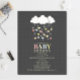 Eine neutrale Babydusche-Einladung, die Wolken mit farbenprächtigen, von ihnen hängenden Herzen illustriert. Passen Sie den Text mit den Details Ihrer Veranstaltung an.