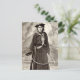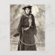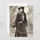 Vintages Foto einer Frau aus dem alten amerikanischen Westen. Sie ist in einem voll geschürten, langärmeligen Kleid gekleidet und trägt einen großen Schal und Hut. Sie hat einen Schussgürtel mit einer Waffe im Holster und sie hält eine Lasso