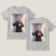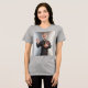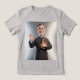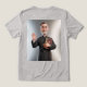 This t-shirt features a Catholic priest in traditional black vestments on a metallic silver background. The priest wears round wire-rimmed glasses, a black cassock with white cuffs at the wrists and a gold cross necklace with a rosary. He holds a brown Bible with a cross decoration in his left hand while waving with his right hand in a welcoming gesture. The priest has a warm, friendly smile and neatly styled brown hair. The t-shirt is a women's grey Triblend short sleeve t-shirt. The t-shirt is made with a soft fabric, has a modern feminine fit and scoop neck.