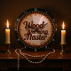 This image presents a round wall clock meticulously designed to resemble a vintage circular saw blade. The clock face has a brushed metallic silver appearance in the center, subtly marked with what looks like distressed elements and faint circular patterns. The outer ring is a dark, rusty brown, forming the distinct, jagged teeth of a saw blade. Small, round "rivet" details are visible along the inner edge of this rusty ring. The words "Wood Working Master" are boldly inscribed in the center of the clock face in a dark brown, stylized script with a subtle three-dimensional effect. "Wood" and "Master" are in larger, more decorative fonts, while "Working" is smaller and nestled between them. Black hour and minute hands emanate from the central hub, but there are no traditional numbers on the clock face, giving it a minimalist and thematic appearance. This clock is an ideal piece for a carpenter's workshop, a home office with a DIY theme, or as a unique gift for a woodworking enthusiast.