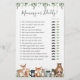 Die Waldtiere-Kinderspielkarte mit dem Thema Babydusche zeigt eine Aquarellwoodland Tiere-Illustration und Aquarellgrüne Eukalyptus-Garland und eleganten handgeschriebenen Schriftart.