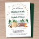 Rustikales Paar's Baby Dusche Einladung mit einer niedlichen Abbildung von Waldtieren mit ihrem Zelt-Camping in den Bergen und Wäldern, ein Overlay von Goldstars, "Unser Bestes Abenteuer wartet" und die Namen der Mutter und des Vaters in einer dunklen Jäger-Grün-Schrift.
