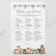 Woodland Tiere Themed Baby Dusche, was in Ihrer Geldbörse Spielkarte ist eine Aquarellwoodland Tiere Abbildung und Aquarell Grüne eucalyptus Garland und elegante handgeschriebene Stil Schriftart.