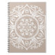 Dieses weiße Mandala sitzt auf einem hellbraunen oder bräunlichen Hintergrund. Die Farbe ist weich und natürlich. Bei manchen Lichtern sieht es vielleicht wie ein warmes Grau aus. Teil der Rosenn Mandala Kollektion.