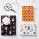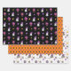 Set von drei aufeinander abgestimmten krümmen Halloween-Packpapieren, die schwarz, weiß, orange, lila und grau sind. Es gibt lila und schwarze Polka Punkte auf orangen, niedlichen kleinen Geistern mit Herzen und Blume auf schwarzem Hintergrund und es gibt eine mit kleinen Kätzchen's in lila Hexenhüten, Herzen und Jack 'olanterns auf einem weißen Hintergrund. Mix, Match und Stack!