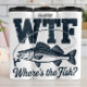 Seine humorvolle Grafik zeigt "WTF" in fett gedrucktem, bedrücktem Text oben. Eine Angelrute dreht sich um eine detaillierte Abbildung eines Fisches, während "Wo ist der Fisch?" unten in einem fließenden Skript steht. Es ist ein relatives und witziges Design für jeden Angler, der einen langsamen Tag auf dem Wasser erlebt.