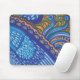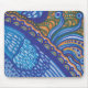 Wunderliches mousepad mit einem einzigartigen abstrakten Entwurf, der Federn und Spitze ähnelt. Funky Kunstwerk mit hellem Himmelblau, königlichem Blau, Mandarineorange und Grün.