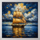 Schön gerendert Segelschiff gegen einen dramatischen Himmel. Das Schiff verfügt über große, leuchtende Segel, die das Licht fangen und eine warme, goldene Farbe schaffen. Der Hintergrund ist voller Blues und dunkler Wolken, die von lebhaften goldenen Highlights durchzogen sind, was auf einen Sonnenuntergang oder Sonnenaufgang hindeutet. Das ruhige Wasser spiegelt die Farben des Himmels wider und verbessert so die Ruhe der Szene. Die Textur des Gemäldes verleiht den Wellen und Segel ein Gefühl der Bewegung und lädt die Zuschauer ein, sich vorzustellen, dass das Schiff durch das offene Wasser segelt.