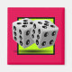 Eine Illustration eines weißen Würfels mit schwarzen Punkten. Der Hintergrund ist mit etwas grobkörnigen Neonfarben in Kalkgrün und Fuschia-Rosa gestaltet.