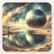 Eine massive metallische Kugel schwebt über einer reflektierenden, kargen Landschaft und schafft eine unheimliche, aber faszinierende Szene. Der Himmel ist voller pulsierender, wirbelnder Wolken und strahlt dramatische Reflexionen im Wasser unten aus.