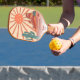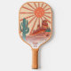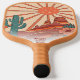 Mit diesem coolen Pickleball-Paddel mit einem Retro-Vintagen Wüstenlandschaftsdesign mit Pickleball-Sonne, Kakteen, Mesa-Bergen und Blume spielen Sie stilvoll. Fügen Sie 3 Zeilen benutzerdefinierten Text hinzu - Name, Monogramm, Pickleball Clubname, Firmenname, Standort, Telefonnummer, etc. Ein perfektes Geschenk für Erwachsene, Kinder, Mütter, Väter oder alle, die Pickleball in der Nähe der Wüste spielen.