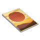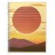Notebook in einem Retro, minimalistisch-wüstenartigen Sonnenuntergang über Hügeln, in den Schattierungen von Rostorange, goldgelb und braun