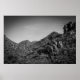 Eine schwarz-weiße Landschaft mit Graffiti auf den Felsen.