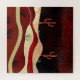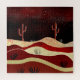 Abstrakte Landschaft einer Wüste mit Saguaro-Kakteen, Peeling-Pinsel, Hügeln und Sternen in Rot-, Crimson-, Beige- und Fetttönen.