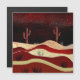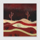 Abstrakte Landschaft einer Wüste mit Saguaro-Kakteen, Peeling-Pinsel, Hügeln und Sternen in Rot-, Crimson-, Beige- und Fetttönen.