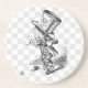 Runder Sandstein-Untersetzer mit einem Bild des Alice im Wunderland-wütenden Hutmachers, der einen Keks in einer Hand und in einer Tasse Tee in der anderen auf einem grauen und weißen Schachbrett hält. See Untersetzer- und Papiercocktailserviette zusammenpassenden Papiers. Sehen Sie die gesamte Märchenland-Untersetzersammlung im FOOD/BEV | Untersetzerabschnitt.