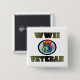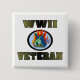 Schroffer amerikanischer Behälter, der über Felsen mit den Flammen glühen im Hintergrund fährt, wenn eine amerikanische Flagge von der Spitze des Behälters wellenartig bewegt, ganz hergestellt in einem kreisförmigen ovalen Emblemartlogo. Schlagzeile, "WWII Veteran," oben geschrieben in metallisches Gold.