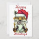 Ein fröhlicher Fuchs, der eine Weihnachtsmannmütze trägt, hält eine Tasse heiße Schokolade mit Schlagsahne und einem Bonbon.