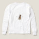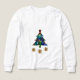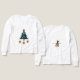 White shirt featuring a colorful Christmas tree with gold-wrapped presents and our obstinate mascot, Acorn the airedale terrier on the back.