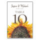 Schöne gelbe und braune Sonnenblumen auf der Tischnummer des Hochzeitsempfangs. Kontaktieren Sie uns für Hilfe bei der Anpassung oder der Anpassung von Produkten.