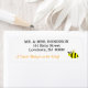 A Sweet Baby is on the Way in orange script. Name and address in black typography. Cute smiling yellow bumble bee with black stripes and fluttering wings buzzing by for the Baby Shower. Original Artwork by TamiraZDesigns.