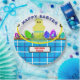 Blaue und weiße Osterkorb. Dekorierte Eier in Rosa und Grün Ostergras und Gelb Tropfgriff nach unten. Glückliche Ostertypografie in tiefblau. Niedliches gelbes Küken aus blauem und grüngelbem Ei geschlüpft. Typo Familienname in rot im schwarz-weißen Rechteck. Original Artwork Design © TamiraZDesign.