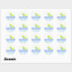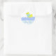 Eine niedliche kleine gelbe Ente mit blauem Bogen und niedlichem Ausdruck. Eine weiche blaue Grenze mit weißen Punkten.